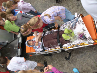 Diese Projektgruppe befasste sich mit vielen verschiedenen Verletzungen, die in der Schule oder auch zu Hause auftreten können. Die Kinder lernten einen Notruf abzusetzen, was sich alles im 1. Hilfe-Kasten befindet und auch wie die vielen Verletzungen versorgt werden können. Highlight war am letzten Projekttag der Besuch eines Krankentransportwagens. Ein ehrenamtlicher Mitarbeiter des DRK schminkte unterschiedliche Wunden, die dann verbunden wurden und erklärte den Kindern die Geräte und dessen Funktionen am und im Rettungswagen.